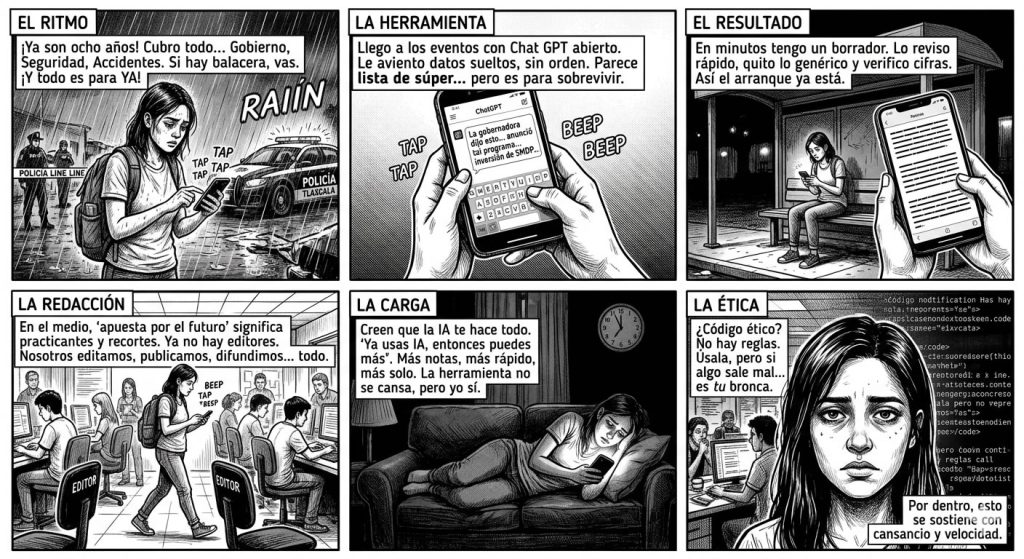 En este contexto, Gabriela describe un cambio en la lógica de trabajo: “Si se puede mandar, se manda. Luego se actualiza”. La práctica de publicar versiones preliminares y corregirlas posteriormente se ha extendido en medios digitales, en un entorno donde la competencia por la atención se da en ciclos informativos cada vez más cortos.