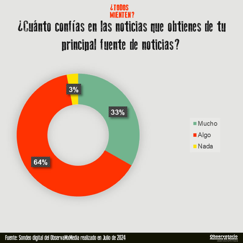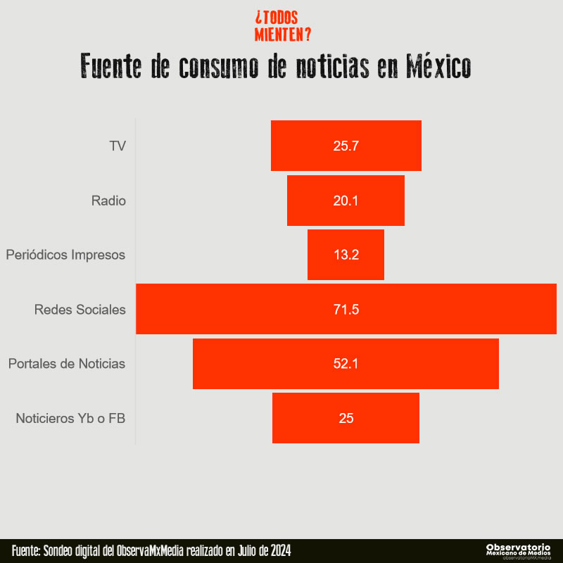 En el estudio realizado por el ObservaMxMedia a personas que se consideran “consumidores habituales de noticias” los datos del sondeo señalan que las redes sociales son la principal fuente de noticias, con un 71.5% de usuarios, seguidas de portales de noticias (52.1%) y televisión (25.7%). El consumo de noticias en las redes sociales es especialmente alto entre los jóvenes de 18 a 24 años, donde el 41.67% usa estas plataformas para informarse. A medida que aumenta la edad de los usuarios, hay una mayor tendencia a utilizar portales de noticias y otros medios más tradicionales como la televisión y la radio, aunque las redes sociales siguen siendo significativas.