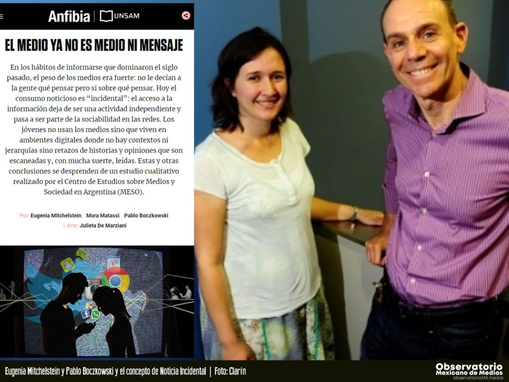 «Hoy el consumo noticioso es “incidental”: el acceso a la información deja de ser una actividad independiente y pasa a ser parte de la sociabilidad en las redes. Los jóvenes no usan los medios sino que viven en ambientes digitales, donde no hay contextos ni jerarquías sino retazos de historias y opiniones que son escaneadas y, con mucha suerte, leídas» señalaban en un ensayo publicado por la revista Anfibia el mismo año y que hoy es referente para entender los hábitos de consumo de noticias actuales.