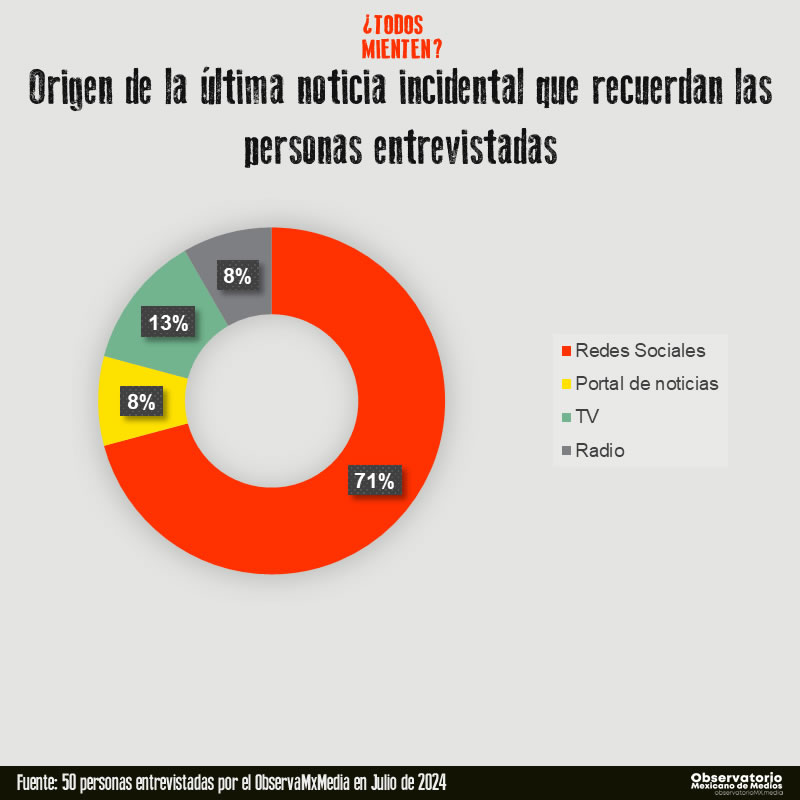 En otro estudio realizado por el ObservaMxMedia a partir de 25 entrevistas dirigidas a personas de diferentes edades y contextos que son consumidoras frecuentes de noticias, se les solicitó que comentaran sobre la noticia más reciente que les generó algún tipo de impacto. Posteriormente se les preguntó ¿Dónde habían visto o leído sobre esa noticia?, el 79% de las personas respondieron que en redes sociales y portales de internet, el 13% en televisión y el 8% en radio.