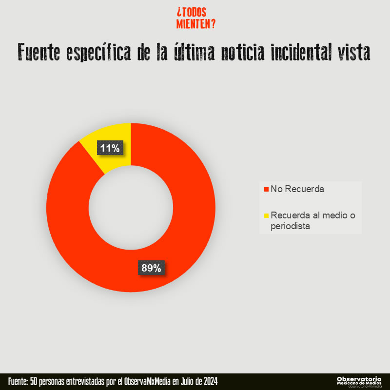Después a las mismas personas se les pidió que fueran más específicas en la fuente de la noticia. Del total de personas que refirieron a las redes sociales y portales de internet como fuente de la noticia de impacto, sólo el 11% pudo recordar el medio y/o periodista que publicó dicha información, el 89% restante sólo pudo recordar vagamente la red social en dónde la vio (Facebook, X, Youtube, etc).